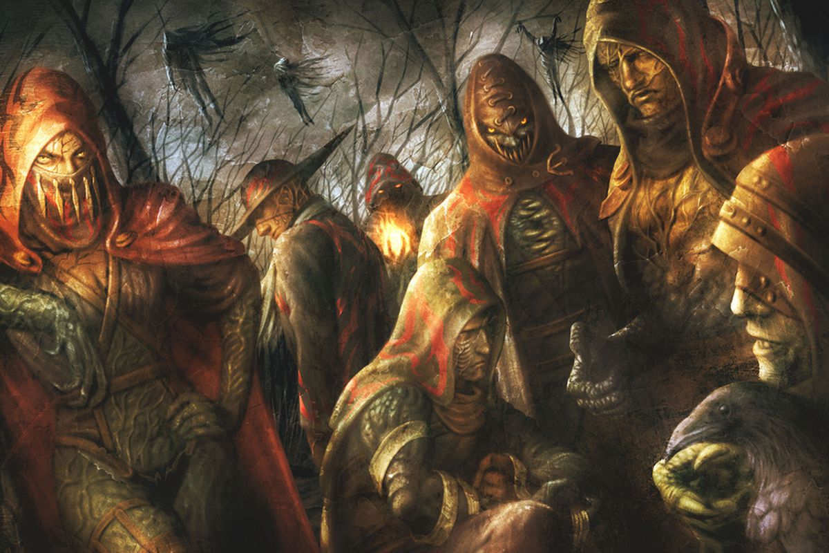 Vous êtes entourés par une dizaine d’humains armés portant un symbole étrange sur le front. Devant la colonne que vous formez, se trouve Velkudo accompagné d’un autre humain habillé d’une tunique sacerdotale, ils portent un symbole différent sur leur front.
